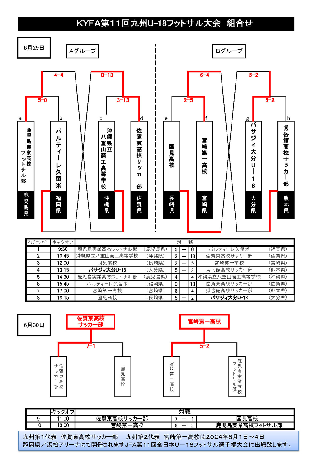 6月29日、6月30日に鹿児島県にて開催されました「KYFA第11回九州U‐18フットサル大会」にて佐賀県代表、佐賀東高校がAパート優勝し九州第1代表として8月1日〜8月4日に静岡県浜松アリーナで開催されますJFA第11回全日本U‐18選手権大会に出場致します。