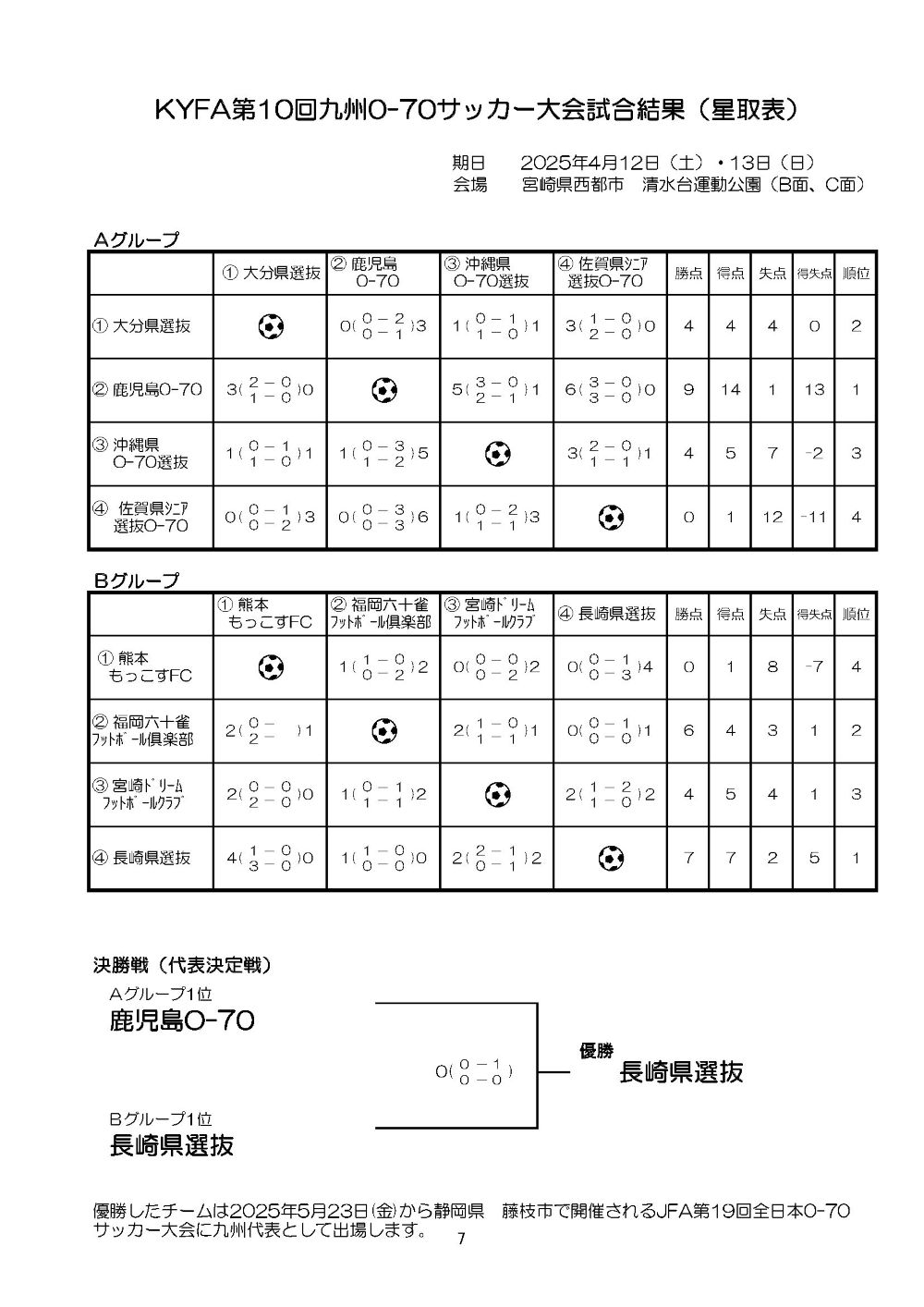KYFA第10回九州O-70サッカー大会 試合結果