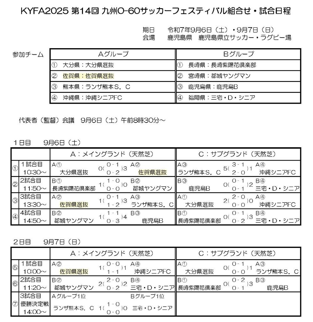 2025/09/11 KYFA2025第14回九州O-60サッカーフェスティバル 試合結果 KYFA2025第14回九州O-60サッカーフェスティバル <試合結果> 2025年9月6-7日、鹿児島県立サッカー・ラグビー場 【結果】Aグループ 勝点4(1勝1分け1敗)グループ2位 >>試合結果 ※ダウンロード