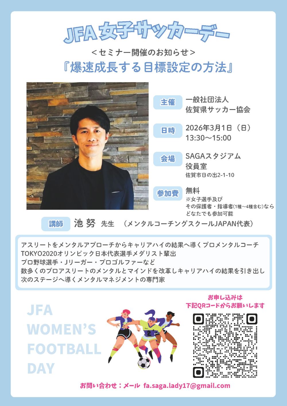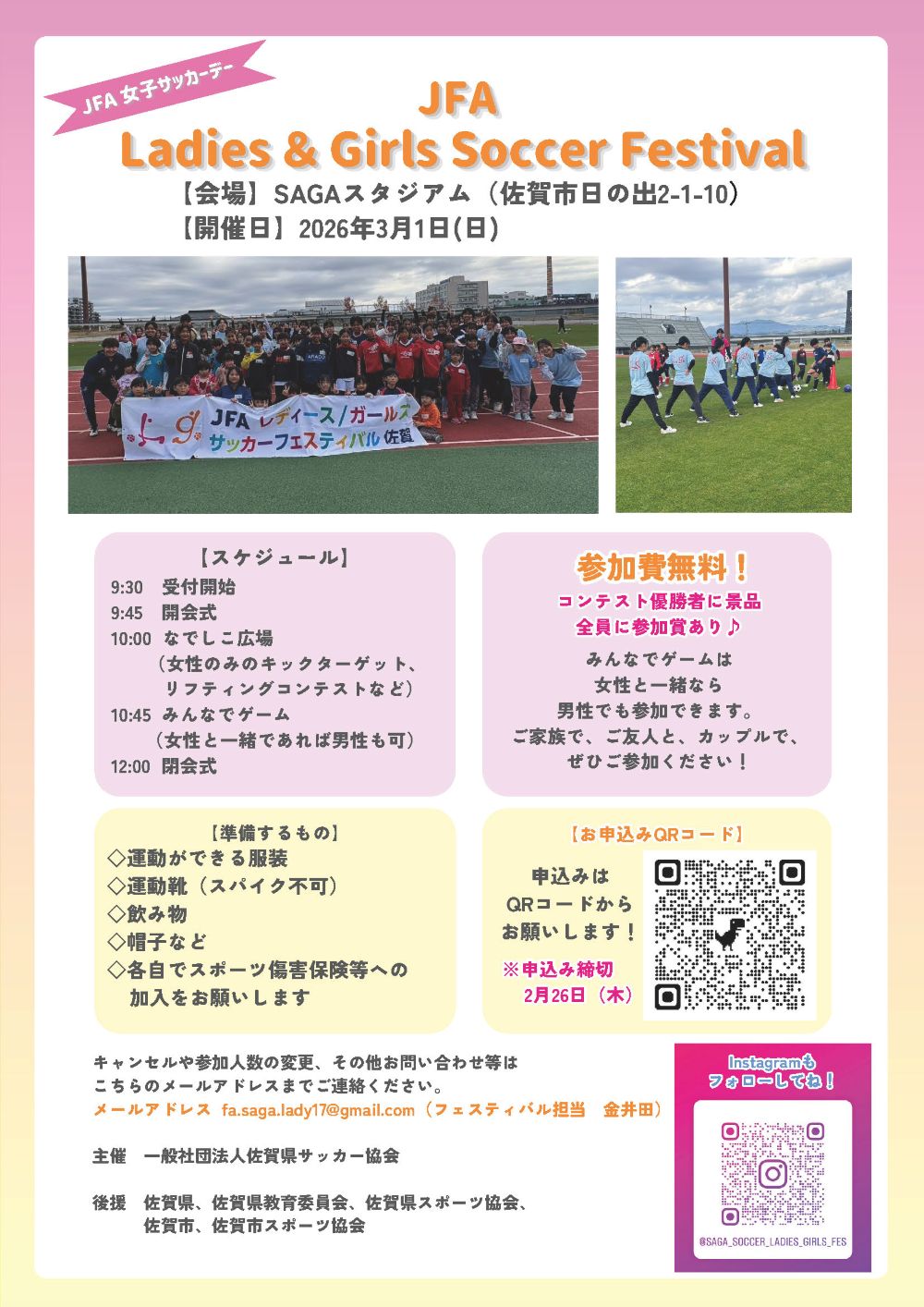 2026/01/27 ~JFA女子サッカーデー~ 「JFA Ladies &girls Soccer Festival」&「セミナー」参加者募集のお知らせ ~JFA女子サッカーデー~ ■期日:2026年3月1日(日) ■会場:SAGAスタジアム